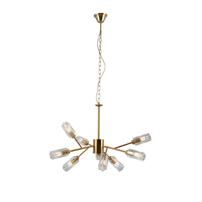 9 ışıklı cam altın avize, 1,5 ila 3 metre (± 2 cm hata marjı ile) hassas yükseklik adaptasyonunu destekleyen endüstriyel 2 metrelik uzatılabilir zincirle donatılmıştır.