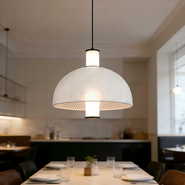 2025 Milano Euroluce sergisindeki en son tasarım trendlerinden ilham alan Strong Lighting'in bu minimalist İtalyan ipek örgü sarkıt lambası, İtalyan minimalizmini pratik işlevsellikle kusursuz bir şekilde harmanlıyor. Merkezi 15W LED ışık kaynağı 4000K nötr ışık yayarak konforlu bir atmosfer yaratır. 1500LM parlaklık ve Ra>80 yüksek renksel geriverim indeksi ile ışık doğal ve gerçekçi olduğundan oturma odaları, yemek odaları ve diğer alanlar için uygundur. Yuvarlak kemer şeklindeki abajur, beyaz ipek kumaşın etrafına sarılmış demir ağdan yapılmıştır ve mat siyah donanım, doku eklemek için sprey boya işlemiyle tamamlanmıştır. Basit tasarım İskandinav, modern ve diğer ev tarzlarına kolayca entegre olur.