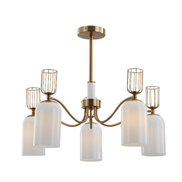 OEM/ODM hizmetleri: Güçlü aydınlatma retro 5 ışıklı süt beyaz cam altın avize değiştirilmiş kaplamalar (antika pirinç/siyah), gölge şekilleri veya zincir uzunlukları olabilir.